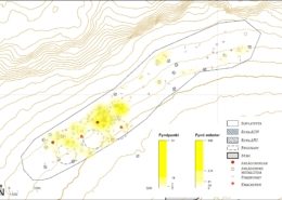 Först ut var Stig som bearbetat fyndspridning och dess relation till den samtida stranden. Till seminariet var resultaten från den övre tidigneolitiska boplatsen, L2022:2676, klara. Du kan se ett exempel på fyndspridning på bilden här intill. Utifrån såväl entnografiska exempel som arkeologiska undersökningar i norden finns det möjligheter att tolka förekomsten av exempelvis knackstenar, kärnor och yxor som medvetet kvarlämnade. Både som en resurs, men möjligen också som en signal om platsen inte är övergiven, bara inte brukad just nu. I vårt fall kan vi koppla de två knackstenarna som fanns på platsen till ytor som antingen är städade eller har haft en konstruktion som hindrat flintavfall att deponeras där. Troligtvis utgörs de av hyddor, i detta fall cirka 3,5 meter stora. Den tredje eventuella hyddan har ingen knacksten knuten till sig och ska bara ses som en möjlighet, denna ”städade” yta kanske representerar något annat.
